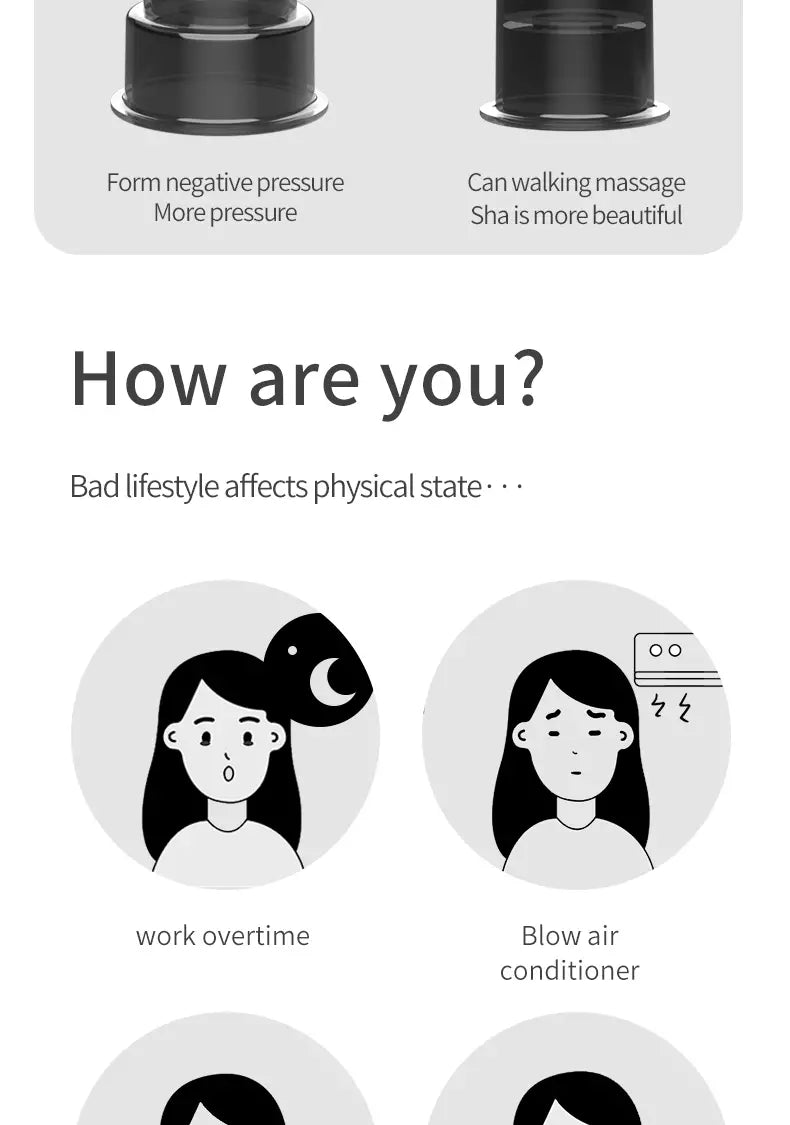 Place the cup on your problem area, press the button, and feel the gentle suction pull tension from deep within your muscles. Adjust the intensity to your preference and let the therapeutic suction work its ancient magic.